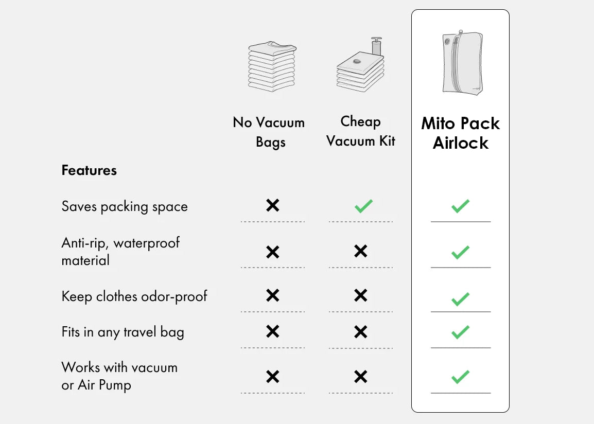 Our airlock tech works by compressing clothing down using an air vacuum. The air trapped within the clothing are sucked out and locked out.